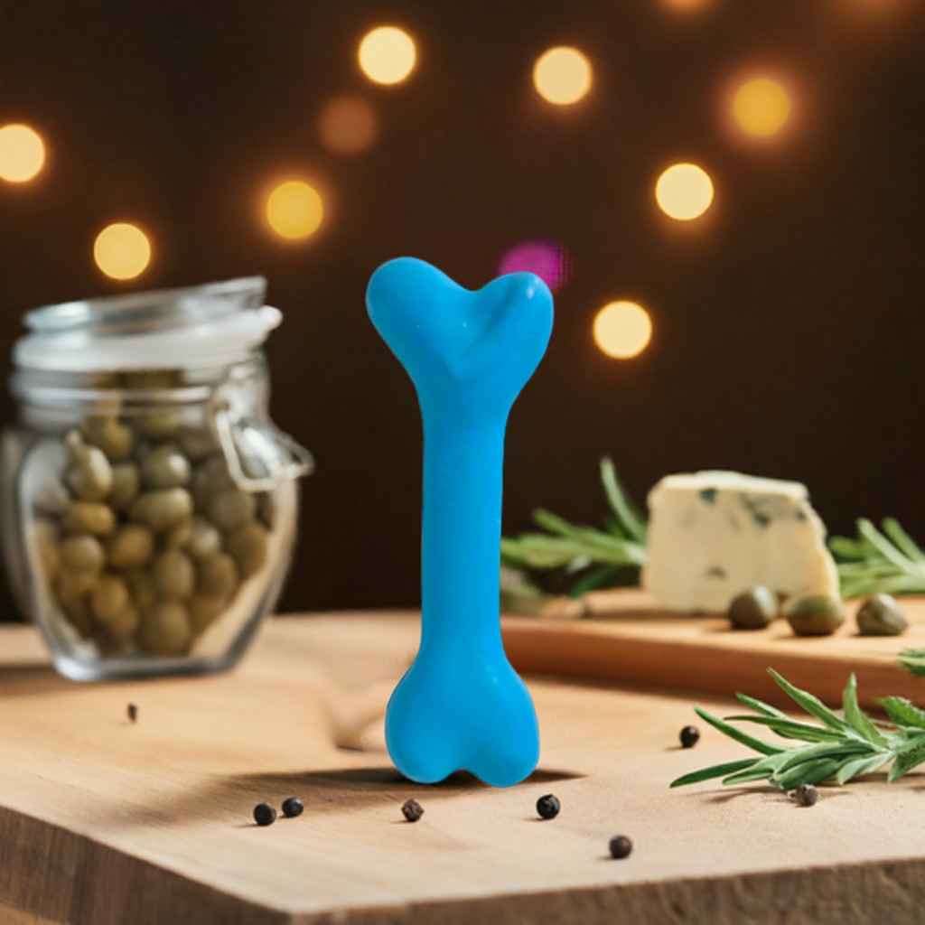 Está fabricado con goma natural, es perfecto tanto para sesiones de juego activo como para momentos de entretenimiento en solitario. Con su diseño de hueso, resulta ideal para jugar a lanzar y traer, ayudando a reducir el estrés.